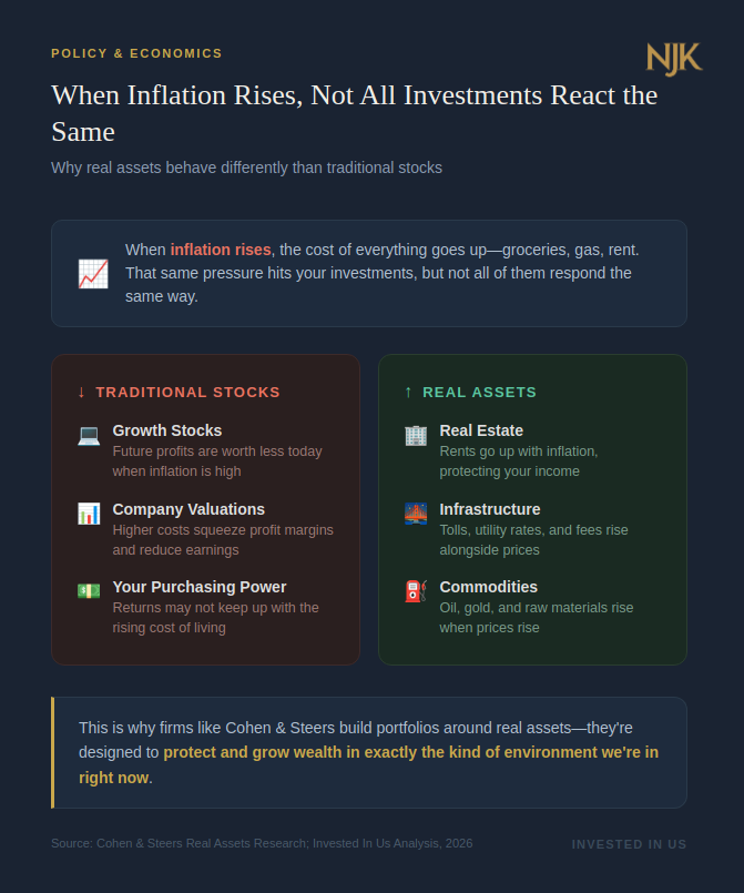 But real assets work differently. If you own an apartment building, rents tend to go up with inflation. If you own a toll road, the tolls go up. If you own commodities like oil or gold, their prices tend to rise when everything else gets more expensive too. These investments are tied to real, physical demand not just promises about the future.