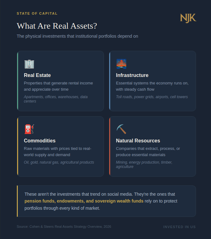 When most people think about investing, they think about buying stock in companies like Apple or Tesla. But the largest, most sophisticated investors in the world? A big chunk of their money goes into physical things: buildings, roads, energy infrastructure, natural resources.